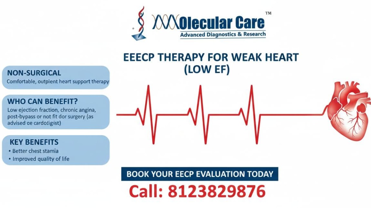 Molecular Care offers advanced EECP Therapy for weak heart (low ejection fraction) as a safe, non-surgical, outpatient heart support treatment. EECP (Enhanced External Counter pulsation) helps improve blood circulation, reduce chest pain, and enhance overall heart performance.